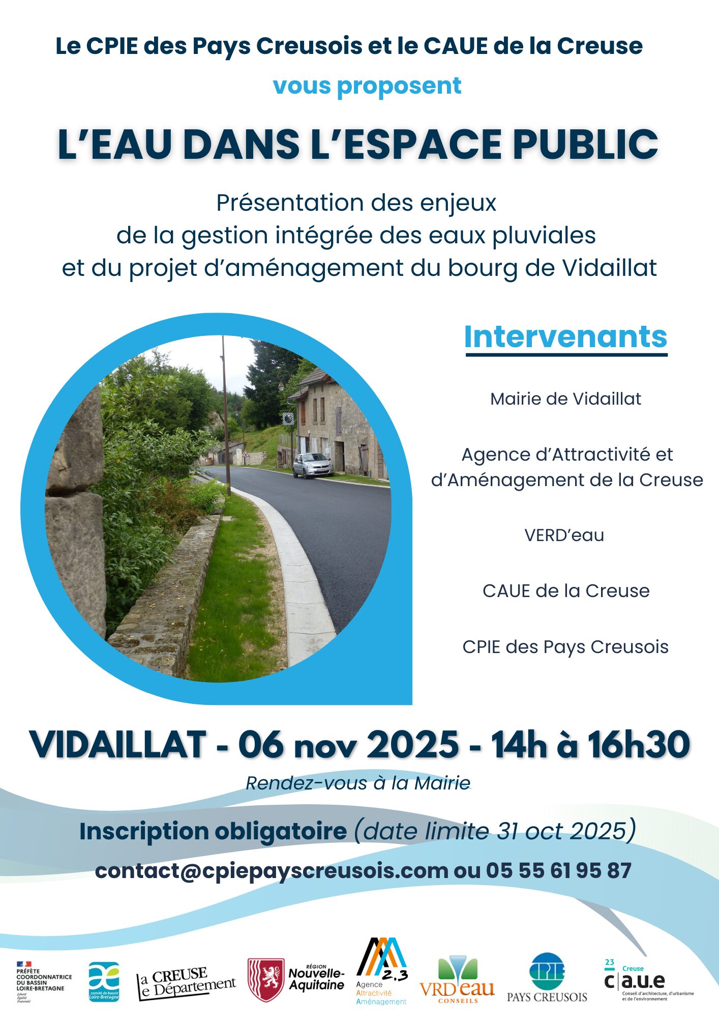 Dans le cadre de ses actions de sensibilisation et d’accompagnement des collectivités, le CAUE de la Creuse co-organise, aux côtés du CPIE des Pays Creusois, de l’Agence d’Attractivité et d’Aménagement de la Creuse et de la Municipalité de Vidaillat, un après-midi d’échanges et de visite sur le thème de la gestion intégrée des eaux pluviales dans l’espace public.